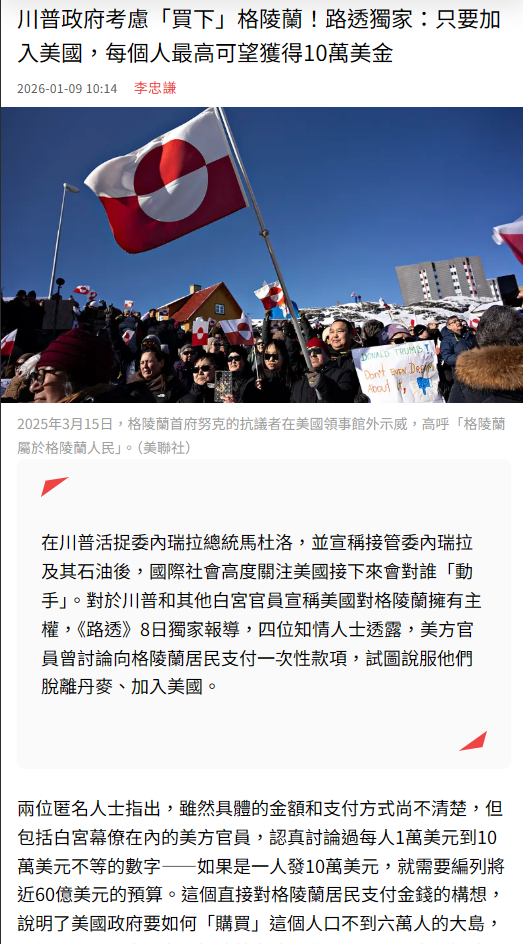根據最新的華盛頓消息,川普團隊正在研擬繞過丹麥主權,直接向格陵蘭 5.7 萬名居民 提出報價: