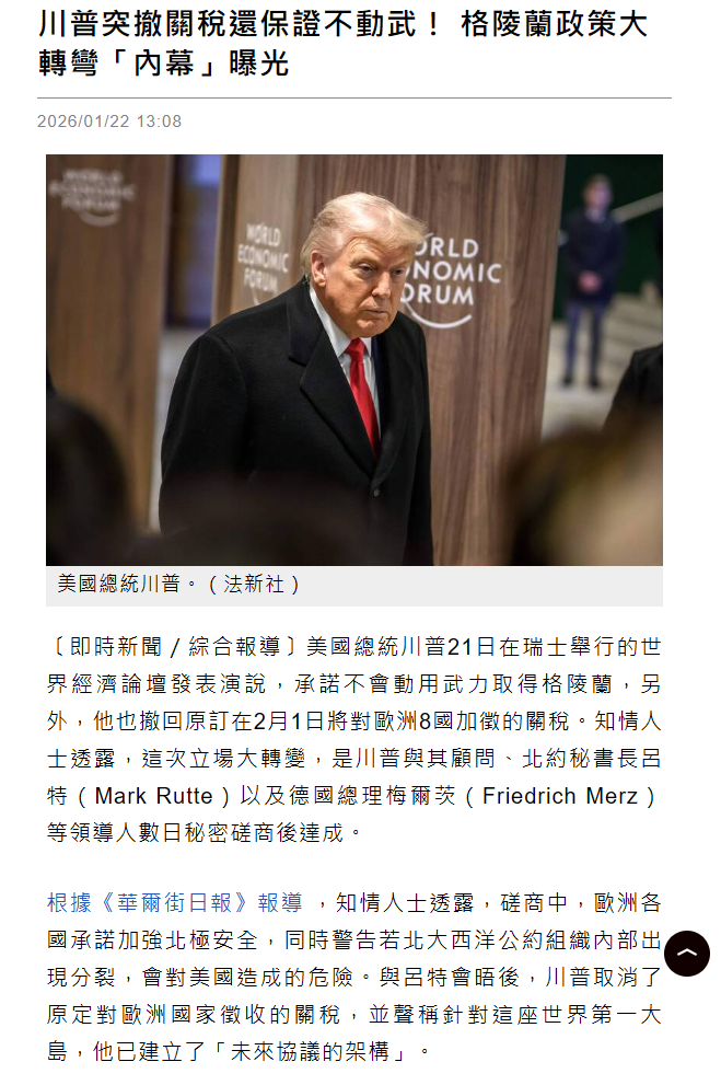 – 交易前:美國要求歐洲增加北極軍費、要求格陵蘭開放更多權限,歐洲不一定買單,丹麥也會說有成本。