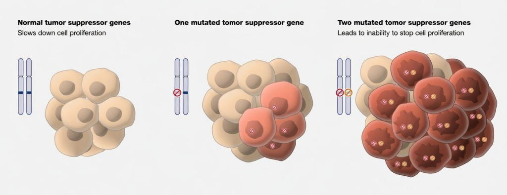 | 發生機制 | 只要運氣不好,隨便一個細胞發生 Hit2 就發病 | 必須在同一個細胞內,運氣極差地連續發生 Hit1 + Hit2 |
