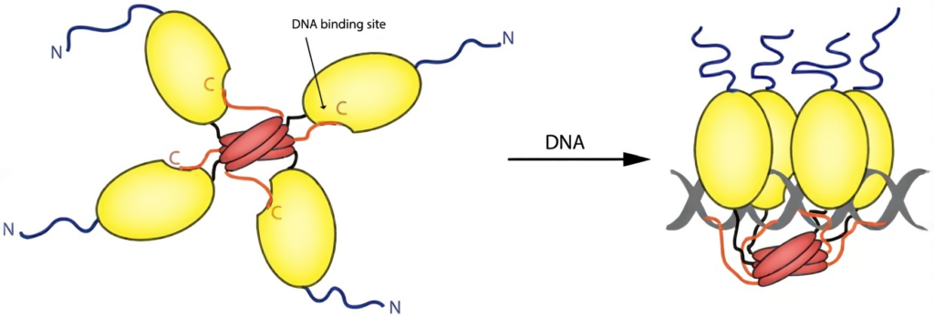 必須 4 個手牽手(形成 Tetramer,四聚體)才能發揮功能去抓 DNA